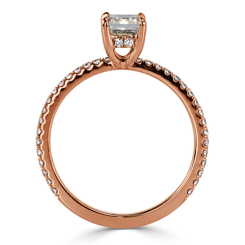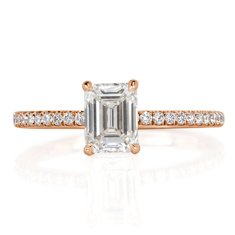 You will be mesmerized by this 1.00ct emerald cut diamond engagement ring! It features a beautiful GIA certified emerald cut center diamond, J in color with a prestigious internally flawless clarity rating. It has a perfect, well-proportioned cut with long, clean and truly captivating facets. Round brilliant cut diamond decorate the dainty micro-pavé rink shank and peek out from between the prongs in this timeless setting. Expertly crafted in 18k rose gold this ring is outstanding. Leaving no detail unattended to, this unforgettable ring is sure to leave an impression!