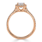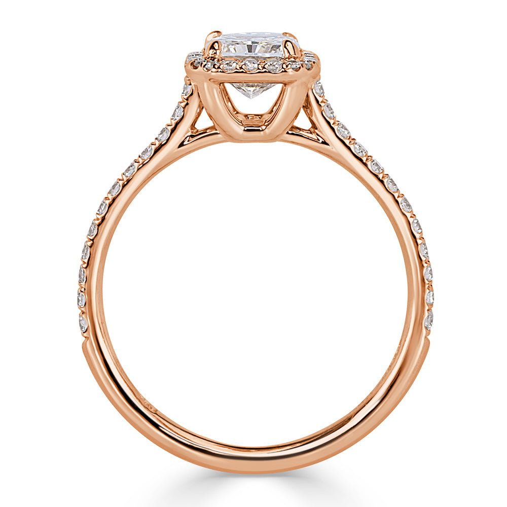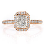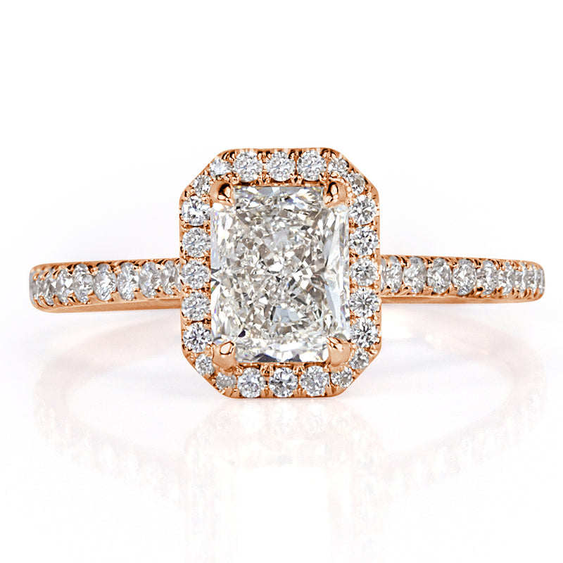 This astonishing radiant cut diamond engagement ring will mesmerize you with its pure color, craftsmanship, and outstanding brilliance! The 1.01ct radiant cut center diamond is GIA certified at G-VS1. It has the most beautiful cut and a prestigious double excellent rating! The elongated shape is absolutely stunning. It is accented by round brilliant cut diamonds set beautifully in a halo and down the sides of the shank in a delicate micropavé setting. This lovely ring showcases the diamonds perfectly with very little metal showing. It is astonishing! You will cherish it forever