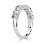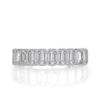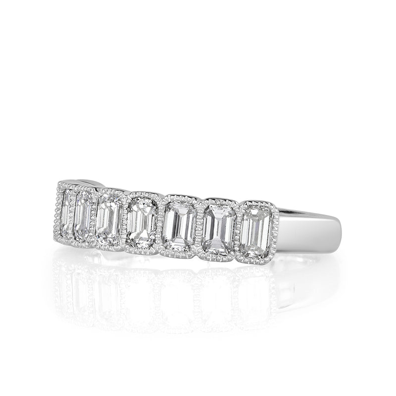Seal the precious moment of marriage vows with this mesmerizing 18k white gold diamond wedding band. Mark Broumand never compromises when it comes to diamond selection and each of the diamonds in this band consist of premium qualities. The emerald cut diamonds radiate vibrant scintillation due to their premium colors of E-F and VVS2-VS1 clarities. Each stone is adorned with a dainty milgrain etching around it, which truly allows the diamonds to pop. This piece of artwork is a unique and beautiful take on a wedding band.