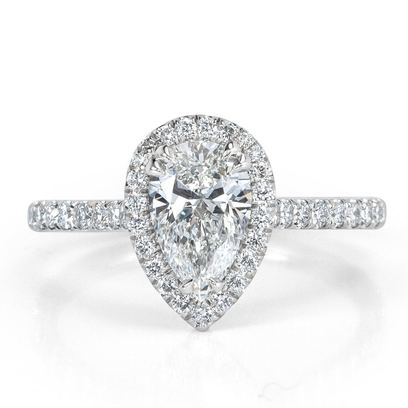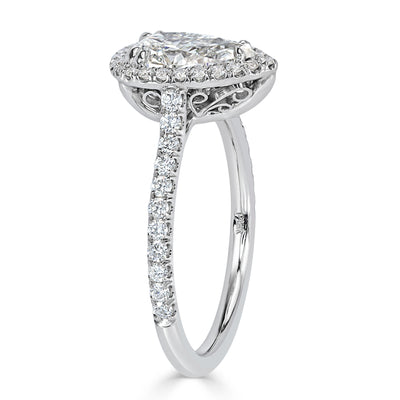 This pear shaped diamond halo engagement ring is stunning and of a great value! The centerpiece features a 1.03ct pear shaped diamond GIA certified at F-VS2. It is brilliantly colorless, perfectly eyeclean and measures at an incredible proportion of 8.94 x 5.53 mm. The mesmerizing one carat center diamond is beautifully accented by sparkling round brilliant cut diamonds set in a micropave setting around it in the halo as well as the sides. The underbasket is handcrafted with an intricately detailed filigree basket design which makes this piece extraordinarily unique. This piece is made in a luxurious platinum setting. It is a classic that she will cherish forever!
