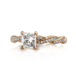Rose gold and brilliantly white diamonds make for an incredibly gorgeous combination on this princess cut diamond engagement ring. The breathtaking 1.04ct princess cut diamond featured in the center is GIA certified at F-VS2. The color on this one carat center stone is of a pristine white and the cut is incredibly bright. The ring is studded with 0.40ct accents of shimmering round brilliant cut diamonds handset in a feminine twist micropave 18k rose gold setting. The delicate 4-prong head setting allows the bold edges of the princess cut diamond to truly pop! This enticing diamond engagement ring is dainty and beautiful and will definitely capture her heart!