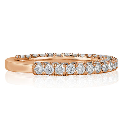 Complete the once in a lifetime moment of marriage vows with this beautifully created 18k rose gold diamond wedding band. Mark Broumand never compromises when it comes to diamond selection and each of the diamonds in this band consists of premium quality. The diamonds evoke intense scintillation due to their white colors of E-F and perfectly eyeclean clarities of VS1-VS2. This diamond wedding band features 3 rows of dazzling round brilliant cut diamonds and is the ultimate symbol of everlasting love.