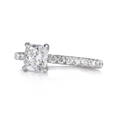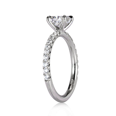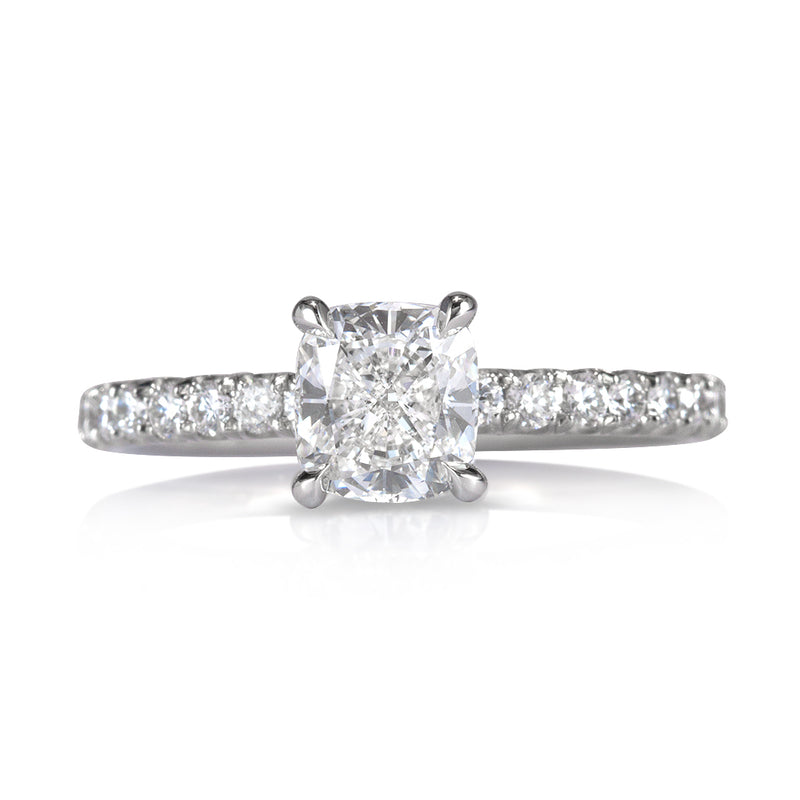 Enjoy the look of simplicity with this cushion cut diamond engagement ring. The single stone is set atop a micro pavé diamond band. Four claws grasp the 1.05ct GIA G-VVS1 center stone in a very sleek way. The ring is designed for a matching band to sit completely flush for a clean look.