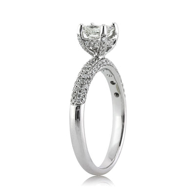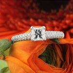 This princess cut diamond engagement ring is super sparkly and so very beautiful. The 0.70ct princess cut center diamond is EGL certified at G-SI1. It is white, perfectly eye clean and cut exceptionally well. It is accented by three rows of round diamonds in a dome micropave setting and features round diamonds studded on the center prongs as well. It is simple, elegant and beautiful!