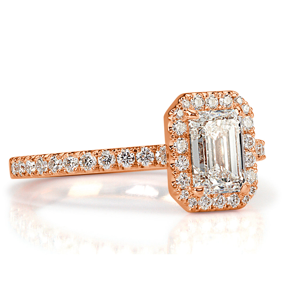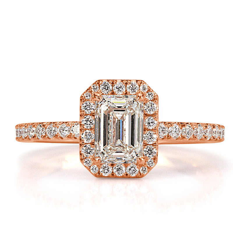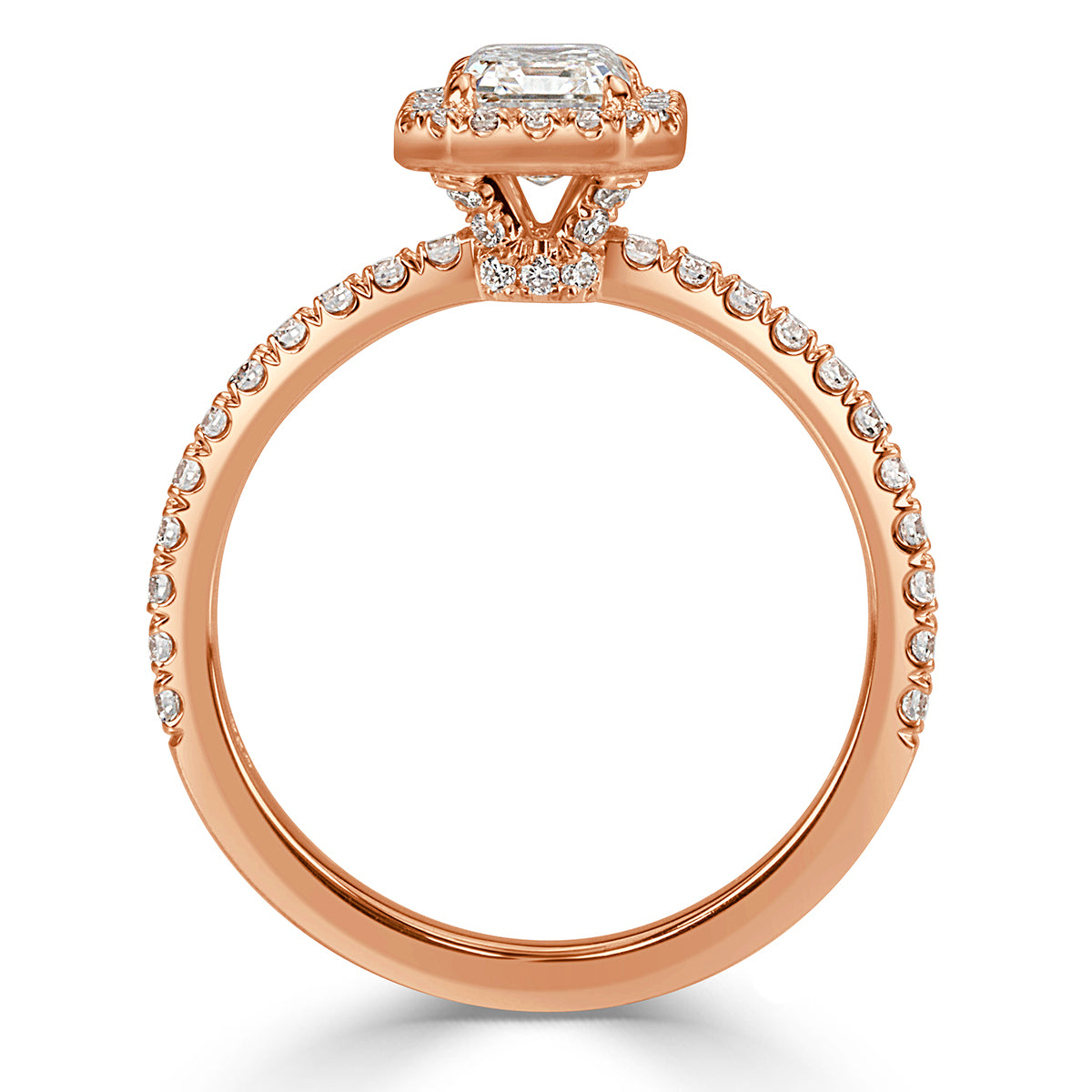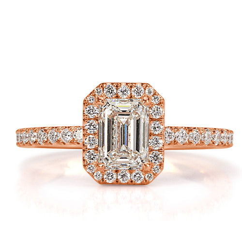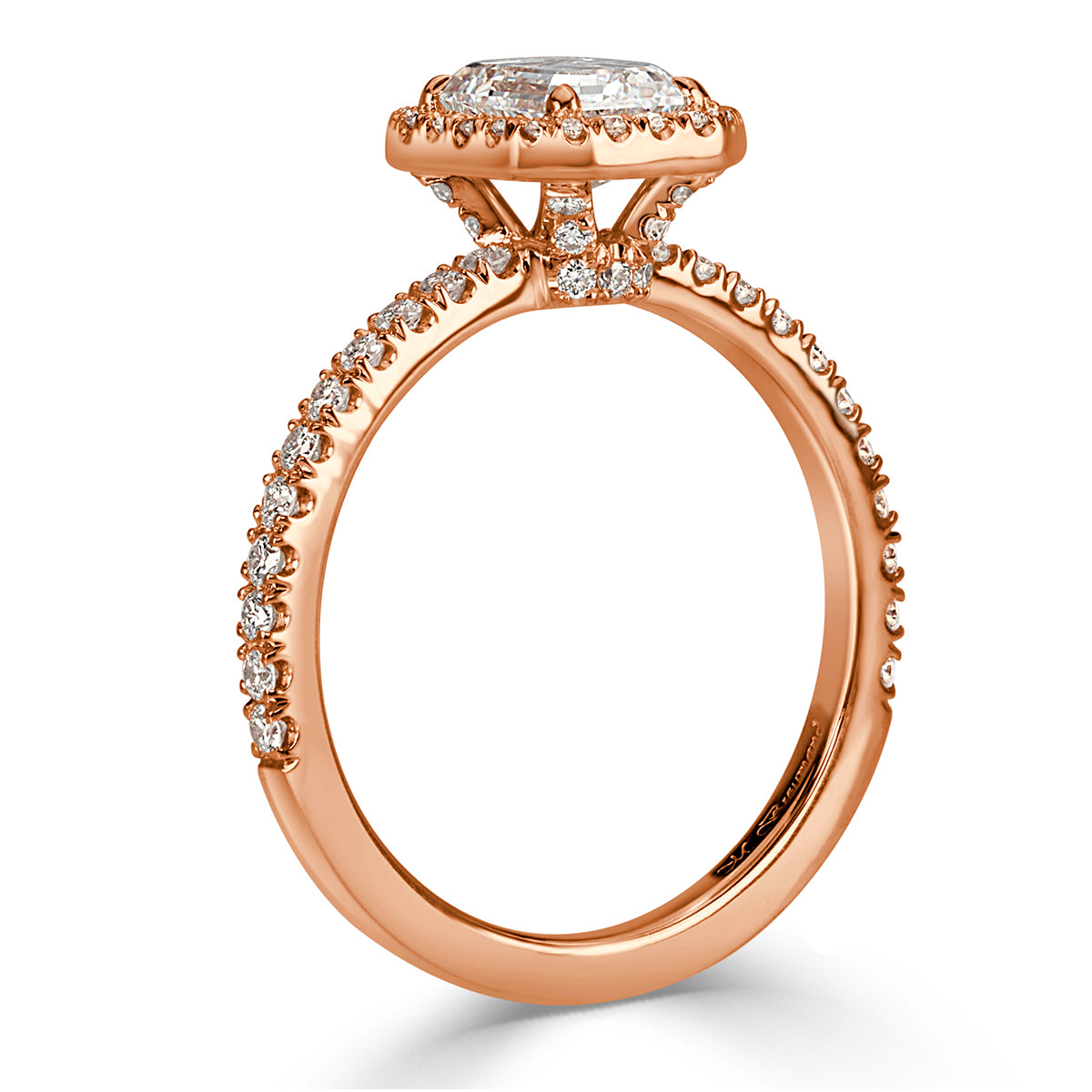 The exquisite beauty of this emerald cut diamond engagement ring is elegant and timeless. It showcases a gorgeous emerald cut center diamond GIA certified at H, VVS2. It is white and the clarity of the diamond is exceptional. It is hand set in 18k rose gold and surrounded by a halo of sparkling round brilliant cut diamonds as well as micro pavé set diamonds going down the dainty shank. Enjoy compliments for a lifetime with this stunning diamond engagement ring!