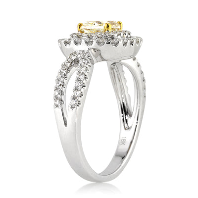 This gorgeous fancy yellow radiant cut diamond ring features a three-quarter carat center diamond, certified at fancy yellow VS2, it is extremely brilliant and beautiful. It is surrounded by a double cushion shaped halo set with round diamonds and a split shank set with round brilliant cut diamonds. It features a low profile top as well. It looks amazing! Get ready for the wows.