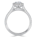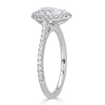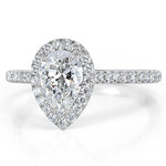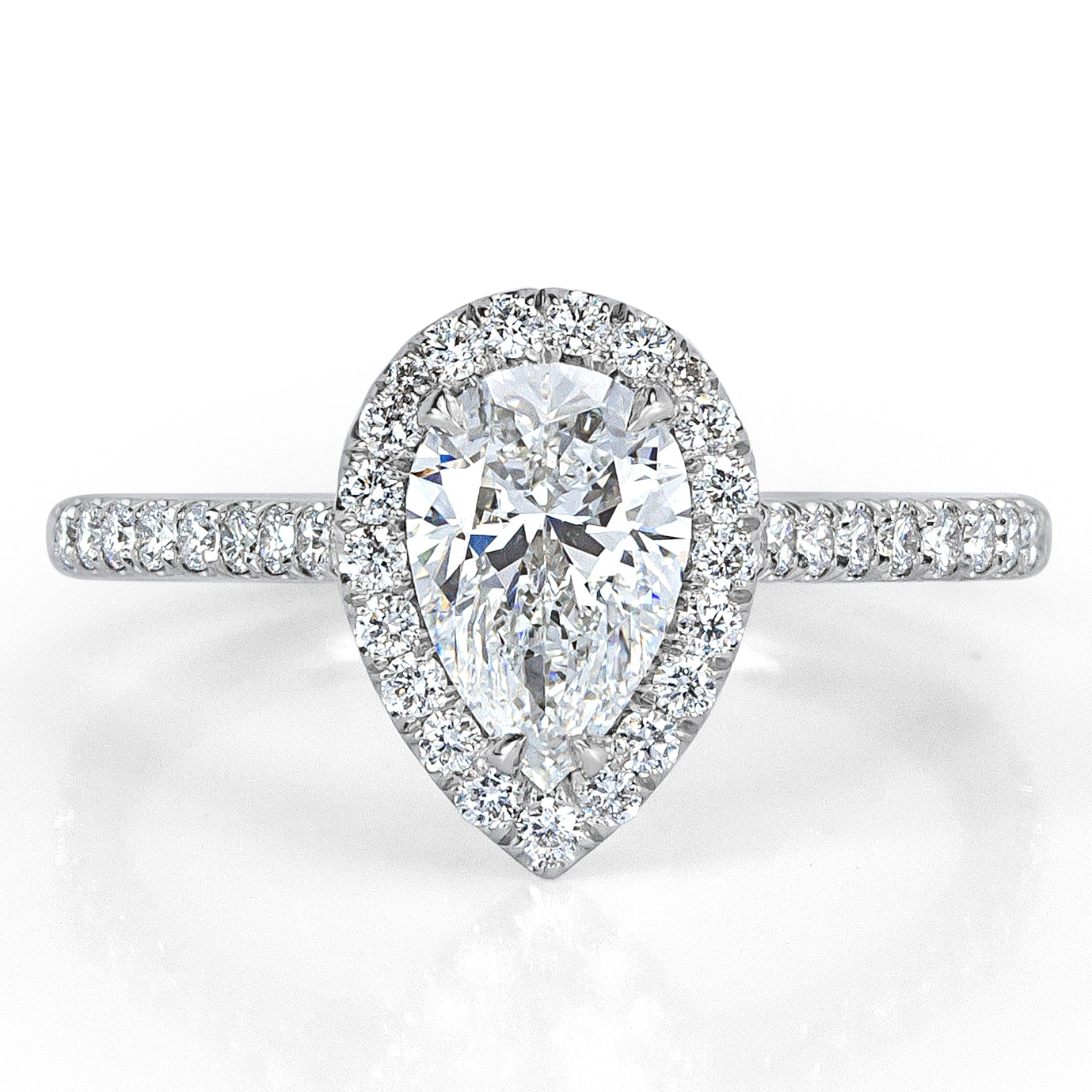 This stunning pear shaped diamond ring is simply beautiful! The mesmerizing 1.01ct pear shaped center diamond is GIA certified at E-VS1. It is exceptionally white, extremely brilliant and the cut is very pleasing! It is accented by a halo of round diamonds and a row of round diamonds set down the shank in a micropave setting. The center basket is studded with round diamonds as well. The ring is hand crafted in high polish platinum and is absolutely amazing. A perfect symbol of your love!