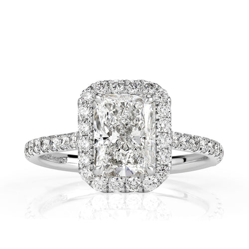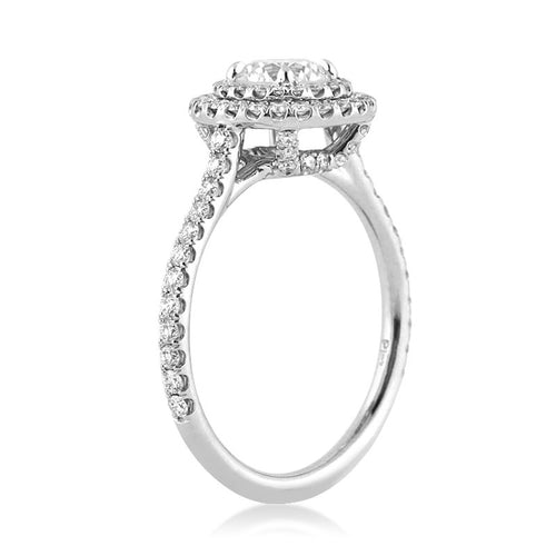This enchanting round brilliant cut diamond engagement ring is perfect in so many ways! The remarkably clear and sparkly round cut diamond poised in the center is GIA certified at E-VVS2. It is exceptionally white and a step away from flawless! The custom-made platinum setting features a double halo of round diamonds in a micropave setting. The shank features a row of round diamonds as well. We embellished the center basket with round diamonds for even more brilliance from every angle! This exquisite piece is sure to get you compliments everywhere you go! Absolutely mesmerizing!