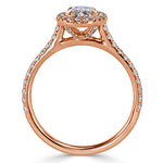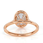 Bright white diamonds and rich 18k rose gold make for a wildly beautiful color combination in this gorgeous engagement ring. The center of this ring features a 1.00ct oval cut GIA certified E-VS1 diamond. It is accentuated by glittering micropave set round brilliant cut diamonds that decorate the halo, basket and shank of this spectacular rose gold ring. This is a truly exquisite engagement ring she will treasure for a lifetime!