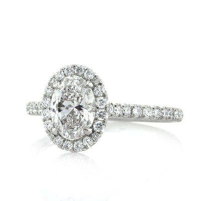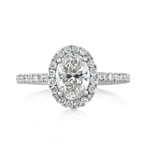Make a statement with this spectacular 1.01ct oval cut diamond engagement ring. GIA certified at F-VS2, this stone is completely colorless and eye-clean. It has the perfect cut that shimmers incredibly bright as the light reflects it, as well as tremendous fire and brilliance. A beautiful halo encircles the centerpiece and serves as the perfect compliment to enhance its beauty. Dazzling round brilliant diamonds at the connectors make for an excellent, subtle accent. This superb ring is set with a one row micropave high polish platinum setting. Make her heart melt with this enchanting oval masterpiece!