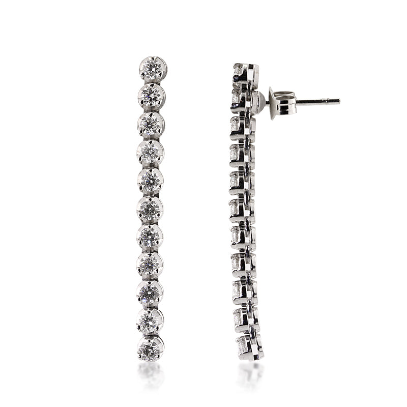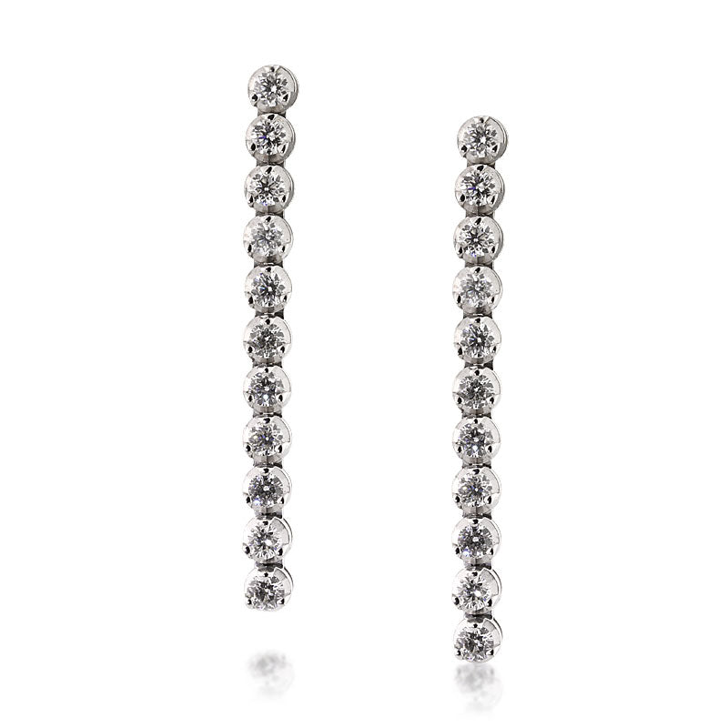 This graceful pair of round brilliant cut diamond drop earrings will sparkle and sway with her every movement. The 18k white gold setting holds 1.55 carats of bright white diamonds.