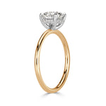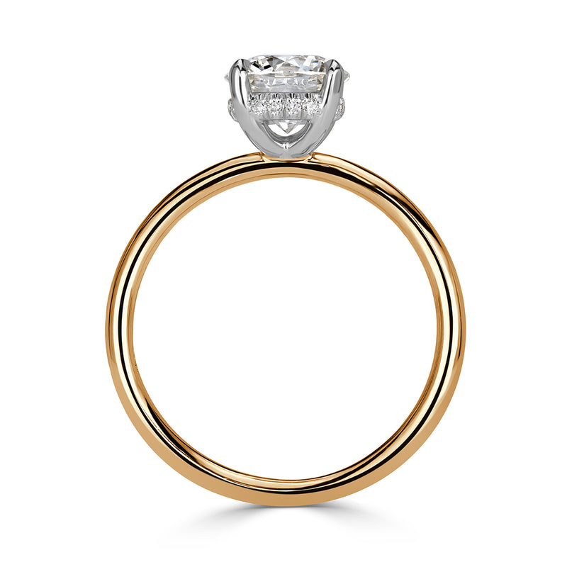 Beauty seeps out of this round brilliant cut solitaire ring from every angle. The centerpiece showcases a stunning 1.50ct round brilliant cut diamond GIA graded at G-SI2. It faces up white, is perfectly eyeclean and displays tremendous brilliance! It is certified triple excellent. This piece features a high polish 18k white gold basket and 18k champagne yellow gold shank for a lovely two-tone design. For additional sparkle, the basket is accented with diamonds in our signature hidden halo detail. Indulge in magnificent sparkle with this incredible round brilliant cut diamond engagement ring.