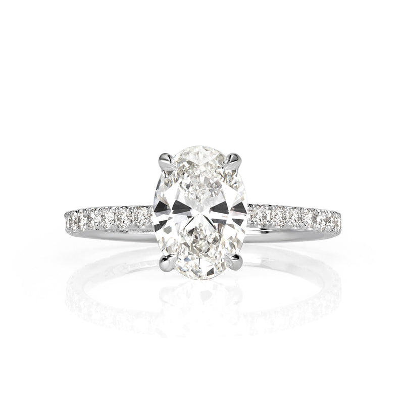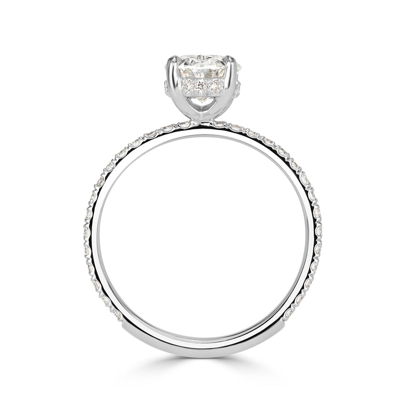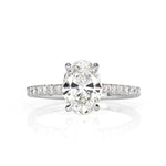 Experience the enchanting beauty of our 1.57ct Oval Cut Diamond Engagement Ring. Exquisitely designed, this ring features a mesmerizing 1.20ct oval cut center diamond that is GIA certified at 7.86 x 5.69mm and is graded excellent in both polish and symmetry. Set in a gorgeous four-prong setting, the diamond's brilliance is showcased in all its glory. Crafted from 18K white gold, the diamond set band adds an extra touch of elegance. With its timeless design and exceptional craftsmanship, this engagement ring is a radiant symbol of everlasting love. Embrace the allure of this exquisite oval cut diamond ring and embark on a lifetime of cherished memories together.