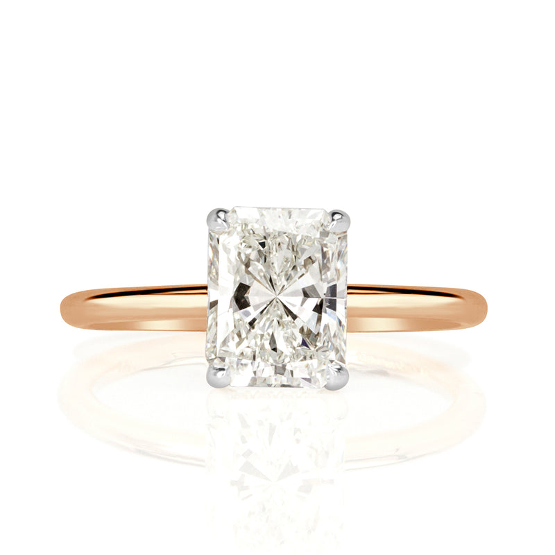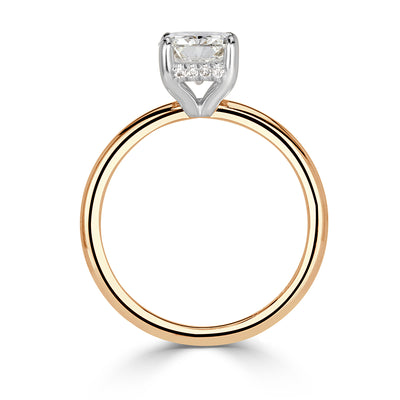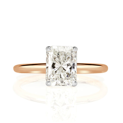This beautiful two toned diamond engagement ring is chic and modern. The centerpiece showcases a stunning 1.50ct radiant cut diamond GIA certified at L-VVS2. The summery warmth of this beauty compliments the lovely champagne yellow of the shank and sparkles with vibrant shimmer. The one and a half carat diamond faces up extremely clear and measures at an amazing proportion of 7.62 x 5.86 mm. It sits right above a delicate hidden halo detail that is accented with additional round brilliant cut diamonds peeking out from the white gold basket. This gorgeous radiant cut diamond engagement ring is perfect for the lady who desires immense sparkle but with a cleaner look.