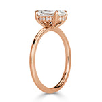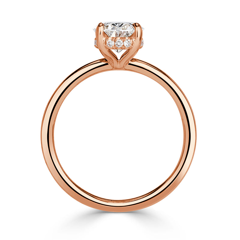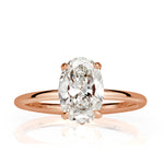 This 18k rose gold solitaire diamond engagement ring is truly a stunner! The centerpiece showcases a stunning 1.52ct oval cut diamond GIA certified at I-VS2. It faces up a brilliant white and is perfectly eye-clean. This beauty measures at 9.45 x 6.29 mm and displays more like a 1.70ct+ diamond. It is also graded excellence for both polish and symmetry. The round brilliant cut diamonds set in the hidden halo are a lovely surprise with additional shimmer added to the overall look. The ring's dainty solitaire design allows for the oval cut center diamond to truly pop and glisten from miles away.