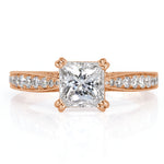 This gorgeous princess cut diamond ring gives you a beautiful vintage look. The super brilliant 1.24ct princess cut center diamond is GIA certified at E-VVS2, colorless and incredibly clear. The shank is pavé set with round brilliant cut diamonds and hand engraved on the sides. There is filigree under the gallery and milgrain throughout for a lovely vintage feel. This mesmerizing piece is so beautiful!