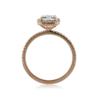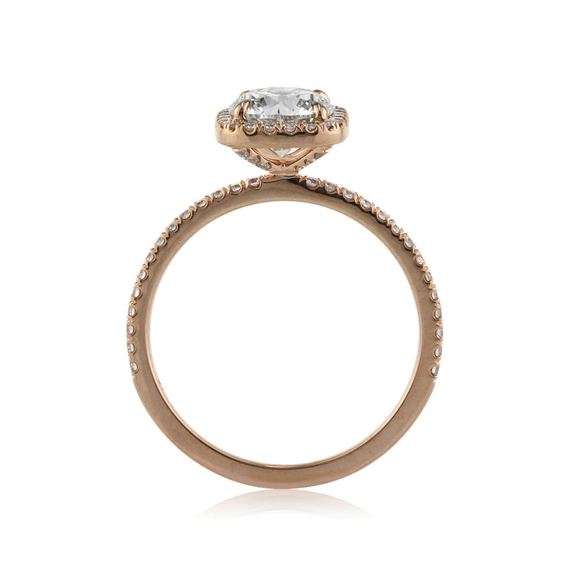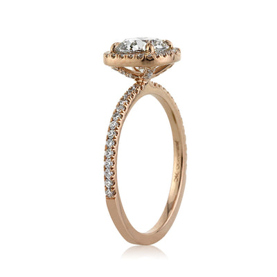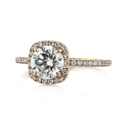 Everything about this 1.19ct round brilliant cut diamond engagement ring is fantastic! It is an incredibly clear and glimmering GIA certified stone at I-SI1. Adorned by a dainty cushion-shaped halo of diamonds set in a custom made 18k rose gold micro pave setting, this ring still manages to make a big statement. Diamond studded accents on the connectors add shimmer to the design and compliment it perfectfly. This ring is extraordinary on every level!