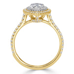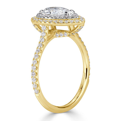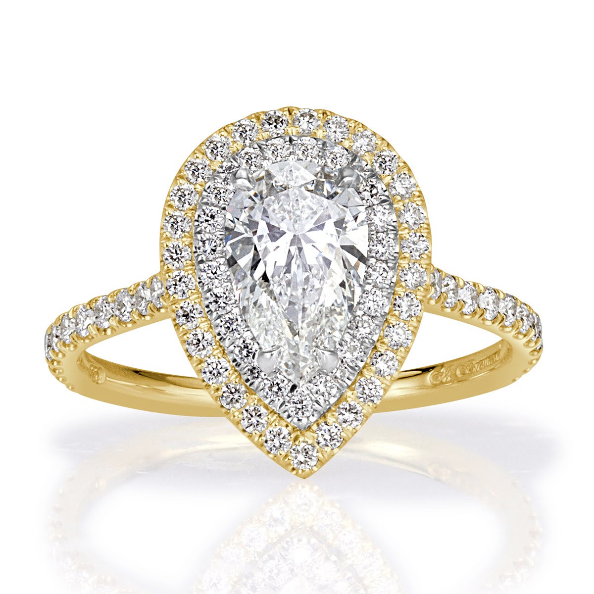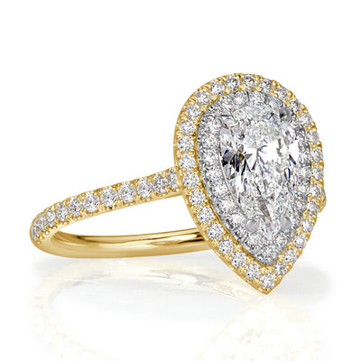 This captivating 2-toned pear shaped diamond engagement ring is handcrafted with incredible detail! The gorgeous 1.03ct pear shaped center diamond is GIA certified at H-IF. It is beautifully white and is a premium crystal clear in clarity. It is accented by a subtle 18k white gold halo of pave set round brilliant cut diamonds, which is then encompassed by another 18k yellow gold halo of diamonds. This chic double halo design really allows the centerpiece to pop and completes the grand allure of this beauty. The diamonds sparkle tremendously with accents studded along the connectors and going down the shank of the ring as well. This diamond engagement ring is truly sensational and one-of-a-kind!