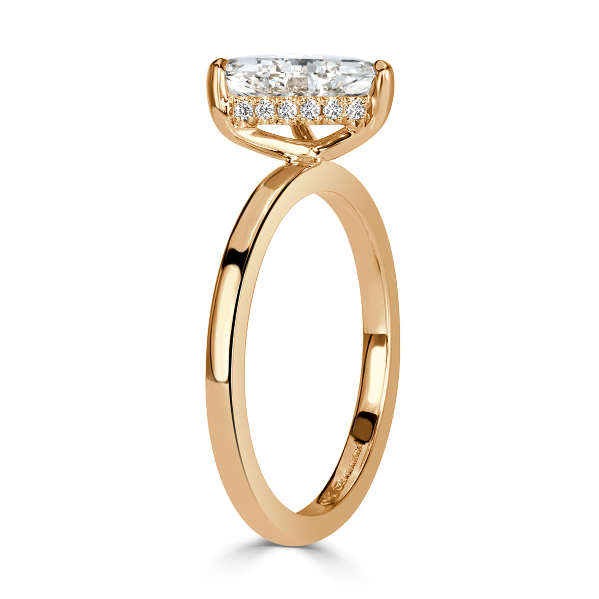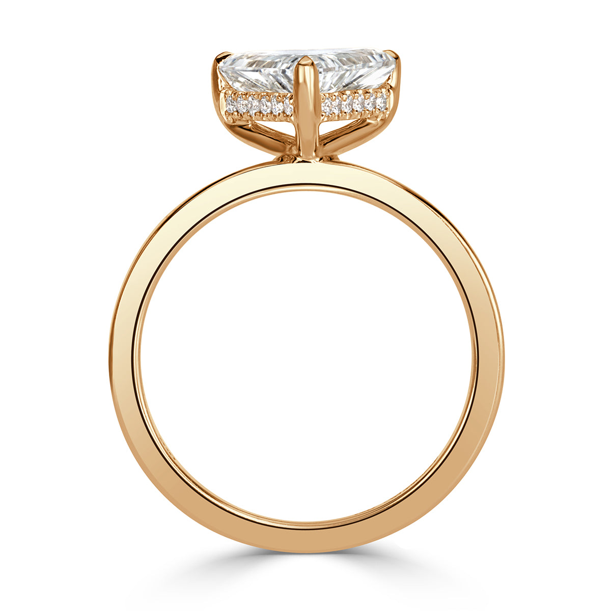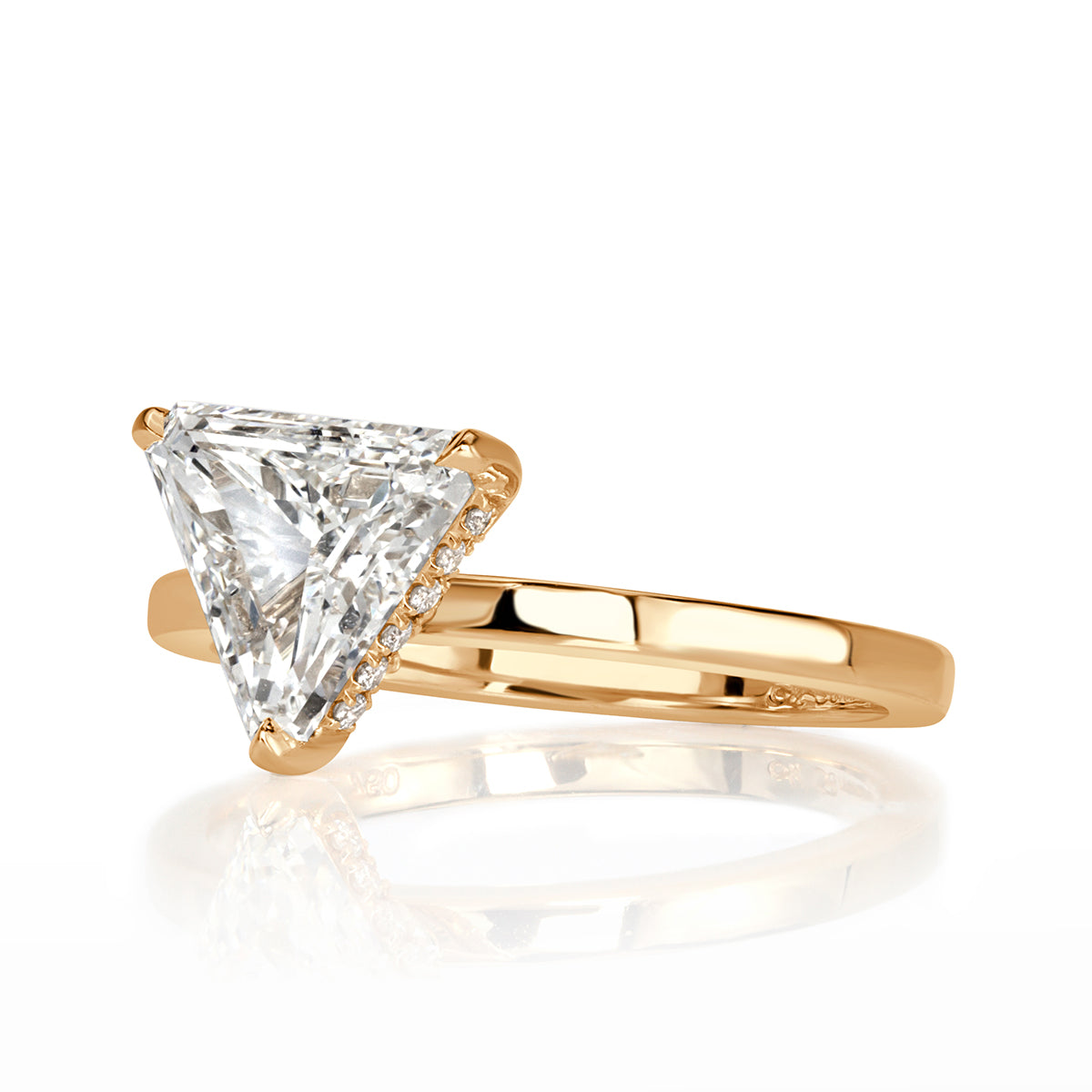 You will be unable to look away from this unique 1.51ct trillion cut diamond engagement ring. This outstanding gem, GIA certified at J-VS2, faces up with tremendous sparkle and is perfectly eye clean. It has a perfect, well-proportioned cut with clean and truly captivating facets you can visibly see at a distance. Its eye catching beauty is truly undeniable. It measures at 7.73 x 9.12mm and is also graded excellent for both polish and symmetry. The high polished 18k champagne yellow gold setting is slightly squared and the plain band allows the center trillion to appear floating on the finger. For extra sparkle, round brilliant cut diamonds are set on our signature hidden halo design. Leave an unforgettable impression with this absolutely amazing trillion cut diamond stunner!