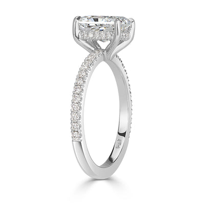 Elegant design, lasting comfort, and premium quality--this radiant cut diamond engagement ring has it all. The mesmerizing 1.30ct radiant cut diamond showcased is GIA certified at G-VS2 and measures at proportions of 7.39 x 5.62 mm allowing it to have amazing finger coverage! This beauty faces up more like a 1.60ct+ diamond and is also graded in excellence for polish and symmetry. It faces up a crisp white and is perfectly eye-clean. The dainty design is handcrafted meticulously and features pavéset round brilliant cut diamonds on the hidden halo as well as down the shank of the ring. This gorgeous platinum engagement ring will last forever and is truly one-of-a-kind!