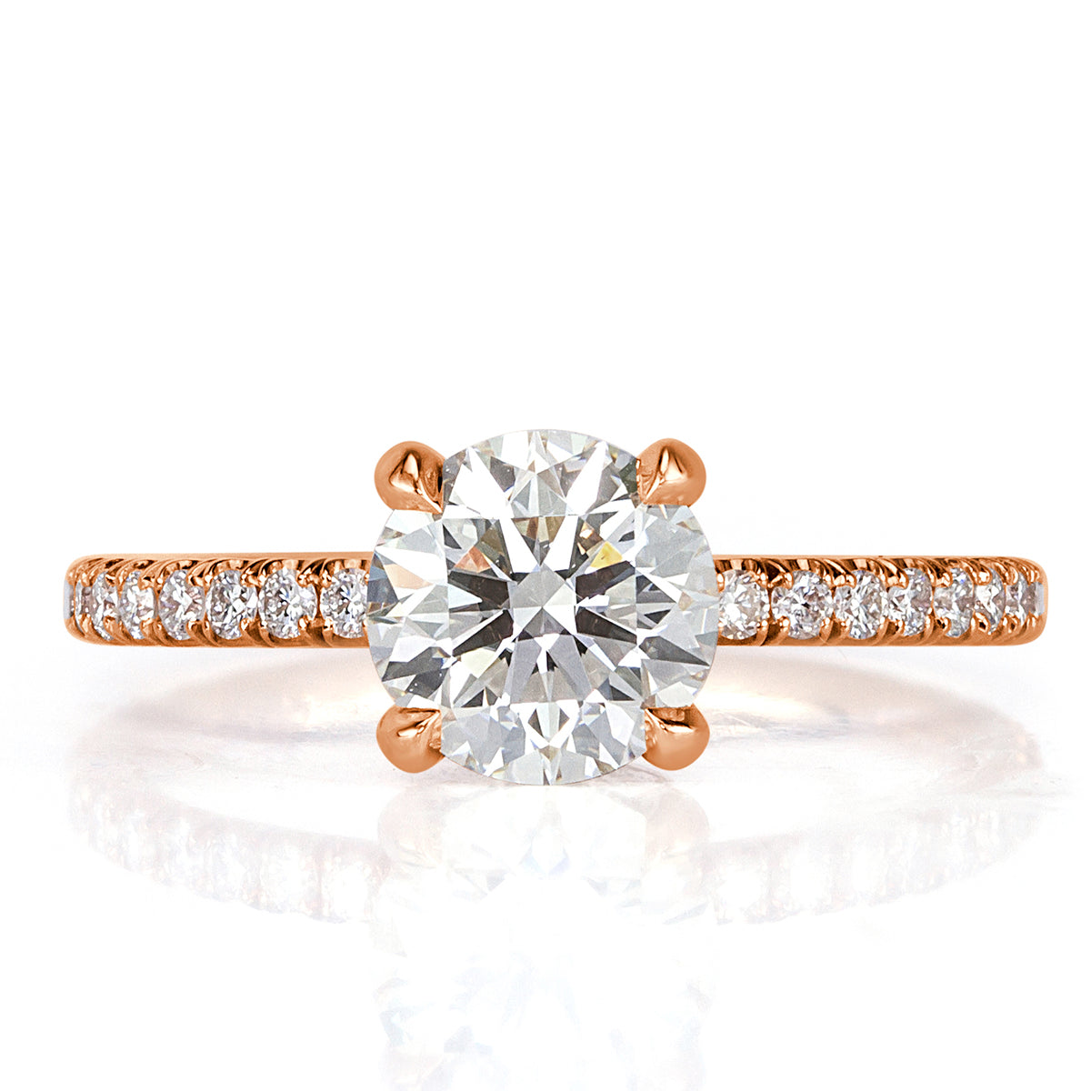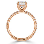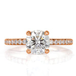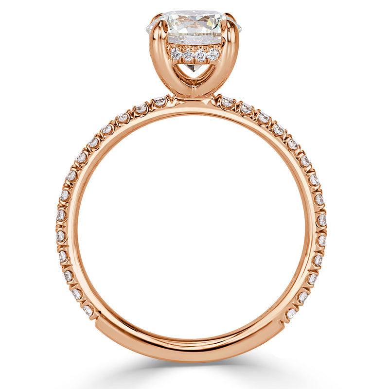 Extraordinarily feminine and elegant, white diamond and rose gold is an alluring combination on this round brilliant cut diamond ring. The stunning 1.30ct round brilliant cut diamond showcased in the center is GIA certified at J VVS2. Illuminating a beautiful warmth of color and at a nearly flawless grading, this diamond has a captivating romantic charm to it. It is set on a dainty micro pavé band with diamonds about three-quarters of the way down. For added beauty, round brilliant cut diamonds are also set on the hidden halo of the basket, which adds a lovely surprise element for that extra sparkle. This masterpiece is the epitome of perfection!
