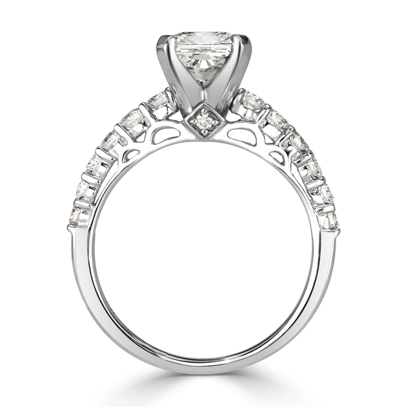 Perfectly proportioned and superbly crafted, this radiant cut diamond engagement ring will capture her heart forever. The stunning 1.46ct radiant cut center diamond is IGI certified at I-SI1, near colorless and with a few minute inclusions. The shape is sleek and it displays great fire. The centerstone is accented with additional round brilliant cut diamonds going halfway down the shank on either side. Fall in love all over again with this gorgeous 14k white gold diamond engagement ring.