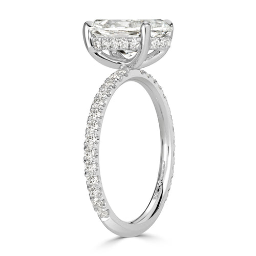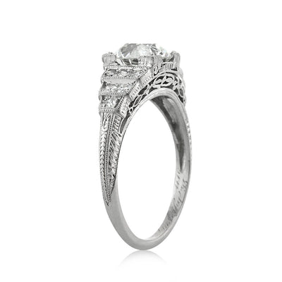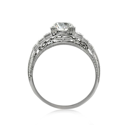 Possess a timeless, Art Deco ring that will forever stand the test of time. The amazing 1.47ct OEC showcased in the center is GIA graded at K-VS2. It possesses lovely facets that sparkle elegantly. Pavé set diamonds are set down the sides of the platinum ring in steps. There are also hand engravings and filigree throughout for added beauty.