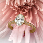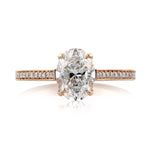 Abundance in beauty, sparkle and quality--this oval cut diamond engagement ring is a winner. The spectacular 1.52ct oval cut center diamond is GIA certified at E-VS2. It is exceptionally white, very clear and the brilliance is mesmerizing. It is showcased perfectly on this handcrafted 18k rose gold setting. The setting features a row of round diamonds pave set on the sides with gorgeous detailed hand engravings throughout the shank. The center basket is studded with round diamonds as well on the connector bar. It is truly spectacular.