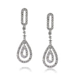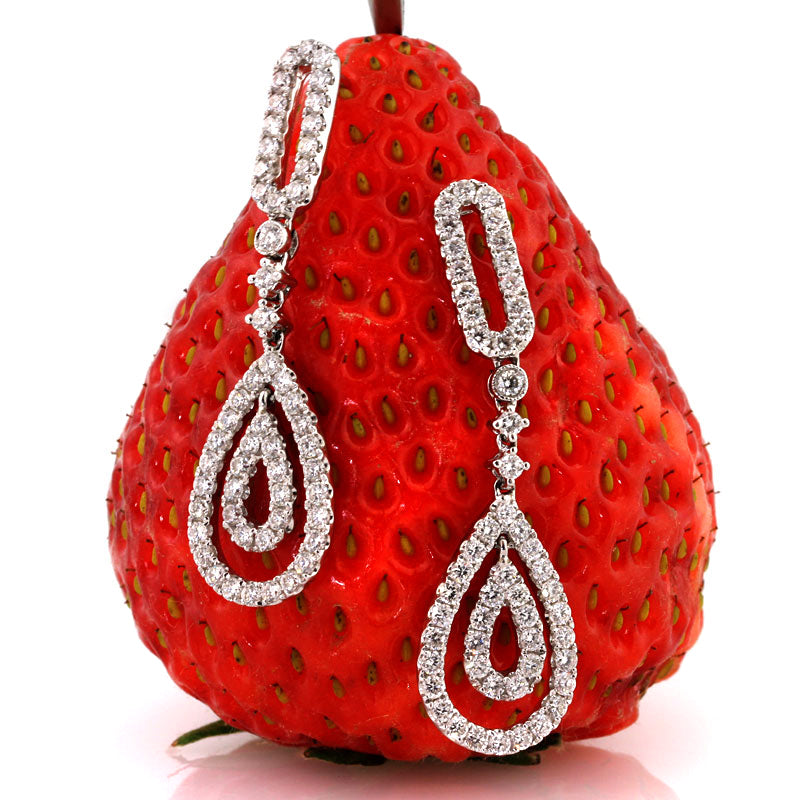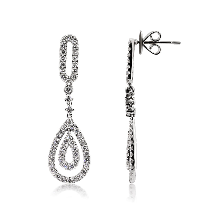 These enchanting round brilliant cut diamond drop earrings evoke a sense glamor and class. There are 1.75 carats of diamonds suspended in the elegant teardrop shaped 18k white gold settings.