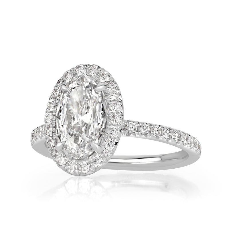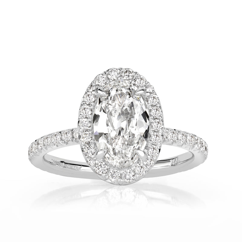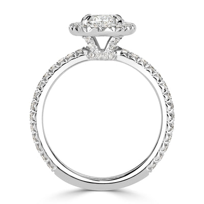 This stunning oval cut diamond engagement ring will sparkle from miles away! This design features a beautiful oval cut center diamond GIA certified at D-VS1. This beauty faces up absolutely colorless and clear with extreme sparkle due to it's amazing cut! It measures more like a 1.50ct+ diamond with astonishing proportions of 9.69 x 5.98mm. The beautifully elongated shape of the oval is adorned by a shimmering halo of round brilliant cut diamonds. Diamonds are also handset on the basket connectors for extra sparkle. The handcrafted 18k white gold shank is adorned with diamonds that are individually placed and finely detailed. She is sure to say ”Yes!” to this feminine and classy oval cut diamond engagement ring.