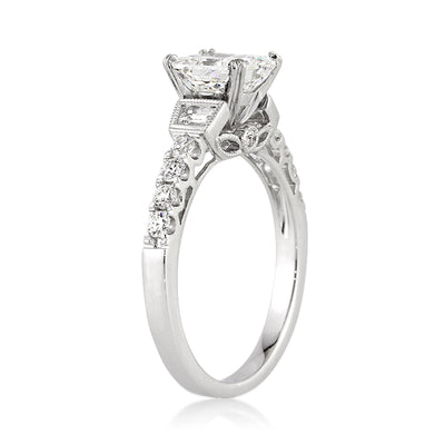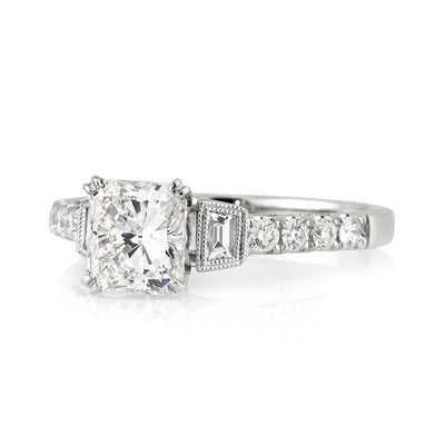 This gorgeous radiant cut diamond engagement ring is breathtaking! It features an astonishing 1.28ct radiant cut diamond in the center. It is GIA certified, one of the leaders in diamond grading, at F-VS2. It is exceptionally white and very clear, even under 10X magnification. The cut is outstanding as well! It gives you the look of a one and a half carat center diamond at a great discount. It is accented by two trapezoid diamonds that are bezel set. The shank is studded with round diamonds in a shared prong design. The front and back of the ring are elegantly designed with a small peekaboo diamond on either side. Unique, elegant and extremely brilliant! You will cherish it forever.