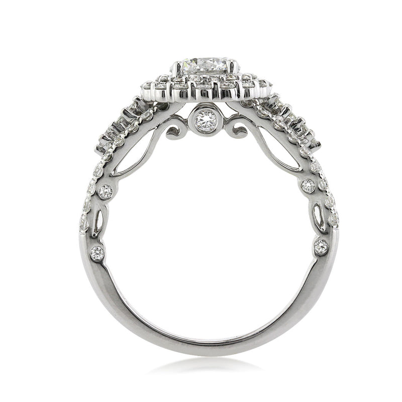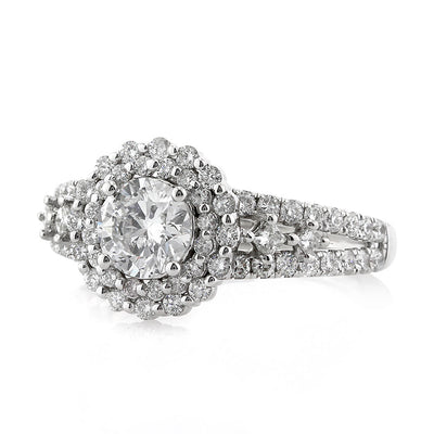 Double halo rings don't get more beautiful than this round brilliant cut diamond engagement ring. Poised in the center of the elegant designer setting is a 0.74ct round brilliant cut diamond graded at F-SI2. It is colorless and very brilliant! The almost three-quarter center stone is encased in a two row halo of round diamonds. The band is a split shank with princess cut diamonds accents. The sides of the lovely ring is detailed with scrolling and peek-a-boo diamonds. She will garner compliments in any room with this ring on her finger!