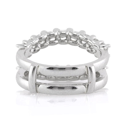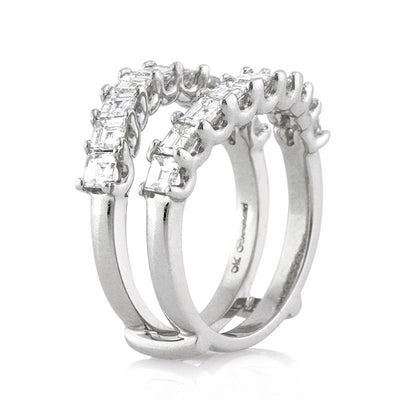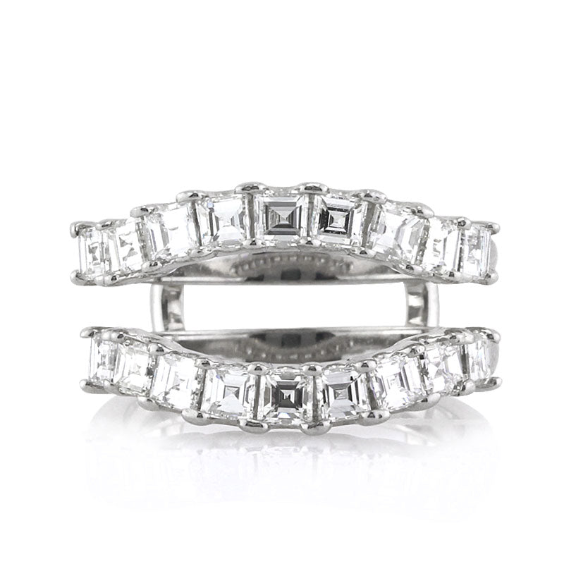 This beautiful diamond wedding ring jacket is the perfect accent to your engagement ring! It features two rows of spectacular Asscher cut diamonds in a beautiful prong setting. This band is made in high polish platinum. We custom make each one of these gorgeous diamond ring jackets to fit each engagement ring perfectly. Contact us for details on creating one to fit your gorgeous engagement ring!