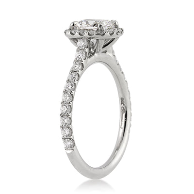This enchanting cushion cut diamond engagement ring is astonishing in so many ways! The beautiful one carat cushion cut diamond poised in the center of this custom made engagement ring is GIA certified, one of the leaders in diamond grading, at D-VS2. It is the whitest color diamond you can purchase and it is very clear, even under 10X magnification. The cut is outstanding and it sparkles tremendously! It is accented by a halo of round diamond and a row of round diamonds set down the shank in a micro pave setting. This setting style is dainty and beautiful and it showcases all of the diamonds perfectly with minimal metal showing. This setting design will allow for a band to sit perfectly flush as well. You will love and cherish this gorgeous cushion cut engagement ring!