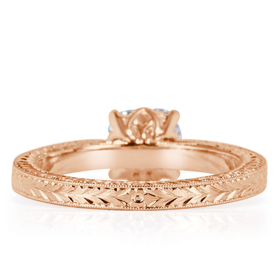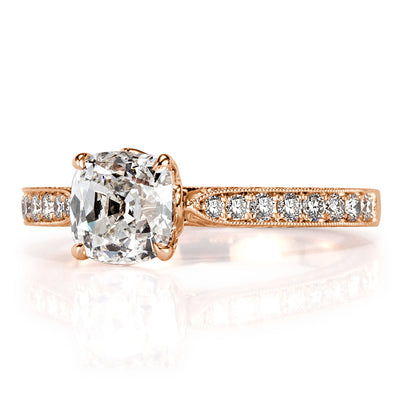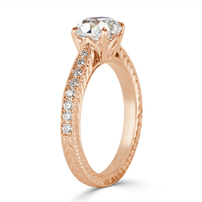 Seek no further for the perfect ring. Quality, beauty, and size are all apparent in this remarkable diamond engagement ring. The 18k rose gold setting has pavé diamonds down the band and hand engraved details on the sides. It showcases a 1.50ct old mine cut diamond at the top. The GIA I-VS1 center stone has a beautiful facet pattern and lovely sparkle.