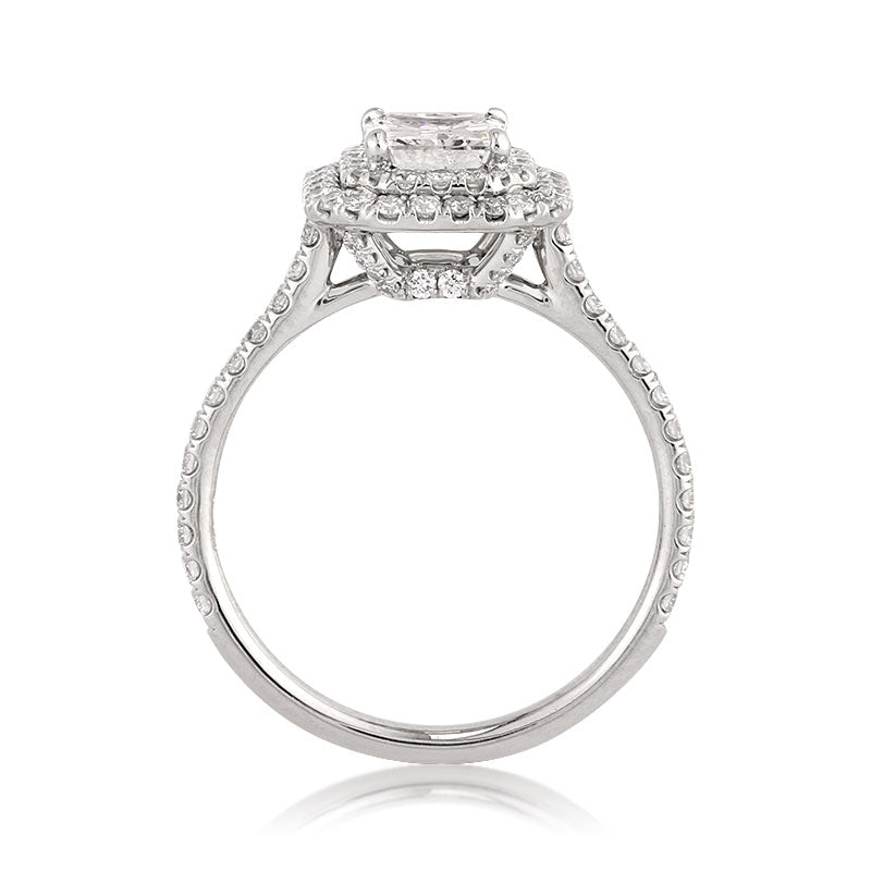 This elegant, beautiful and very brilliant radiant cut diamond engagement ring will mesmerize you. The stunning 1.00ct radiant cut diamond poised in the center of this custom-made setting is GIA certified, one of the leaders in diamond grading, at F-SI1. It is exceptionally white and perfectly eye clean! It is accented by a double halo of round diamonds in a micro pave setting. The shank is set with one row of round diamonds in a micro pave setting. The beautiful center basket is studded with round diamonds for an added touch of brilliance. The ring is made in high polish platinum. You are going to love showing this stunning piece off! It is extraordinary from every angle!