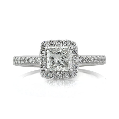 This princess cut halo diamond engagement ring is a phenomenal value and so very beautiful! The gorgeous 1.01ct princess cut center diamond is EGL certified at H-SI3. It is white, eye clean and exceptionally brilliant. The inclusions are small and white and blend in to the diamond perfectly. The halo and shank is set with round brilliant cut diamonds and the piece is made in high polish 18k white gold. It is absolutely stunning! You will cherish this amazing piece.