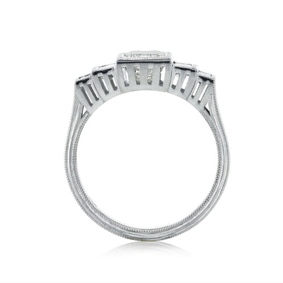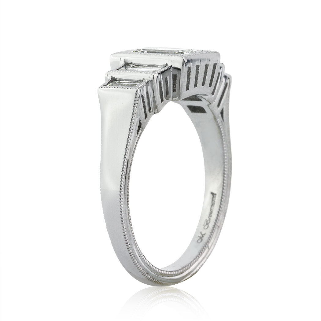 This gorgeous art deco style emerald cut diamond engagement ring features clean lines and a beautiful design. The 1.23ct emerald cut center diamond is GIA certified at H-VS1. It is flanked by two baguette cut diamonds on either side and are all set in a beautiful bezel style setting. The ring features milgrain detail throughout the sides of the piece as well. It is enchanting.