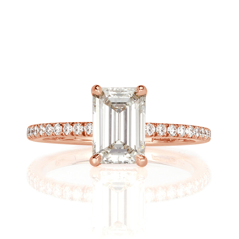 Bathe in compliments with this elegant emerald cut diamond engagement ring on your finger. The centerpiece showcases a beautiful 1.51ct emerald cut diamond GIA graded at I-VS1. It faces up very white and sharp with high clarity. The center stone measures at 8.04 x 5.54 mm and is certified with top gradings of excellence for polish and symmetry. This piece is handcrafted with our signature hidden halo design and with additional round brilliant cut side diamond accents going down the shank. The 18k rose gold emerald cut diamond engagement ring is gorgeous, modern, and ready to be shown off!