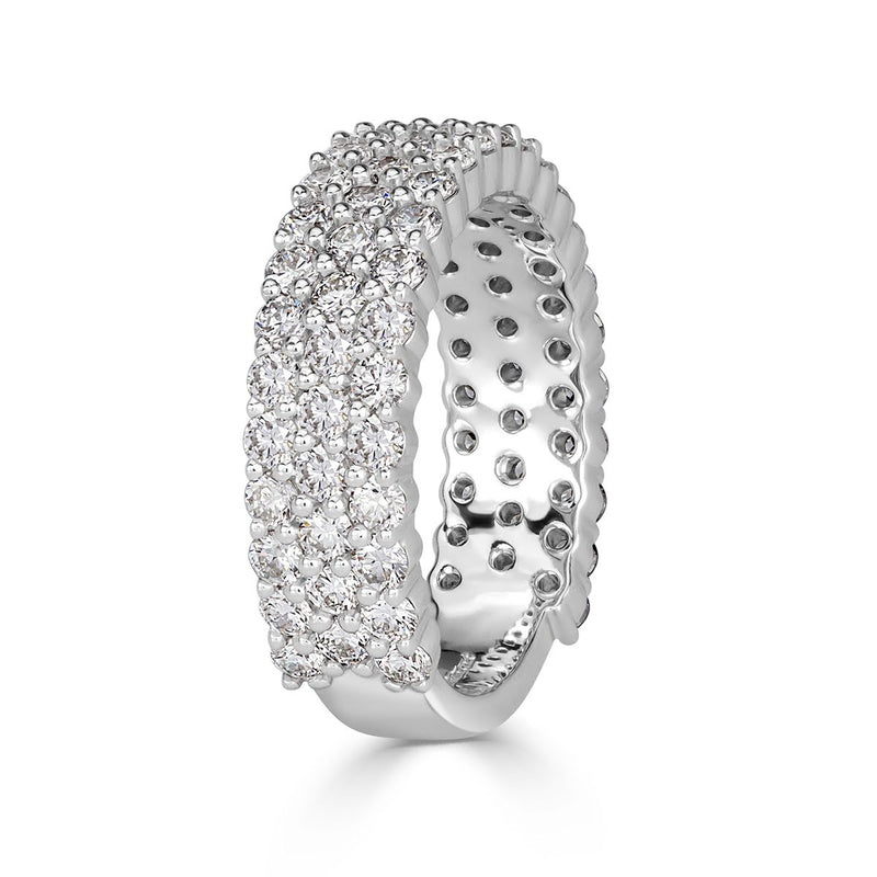 This feminine three-row diamond wedding band is finely handcrafted and is perfect as a stand alone band or paired with other signature Mark Broumand pieces. It is set with 1.85ct of sparkling round brilliant cut diamonds on a stunning high polished 18k white gold setting. The diamonds are certified in F-G colors and VS1-VS2 clarities, facing up a shimmering white!