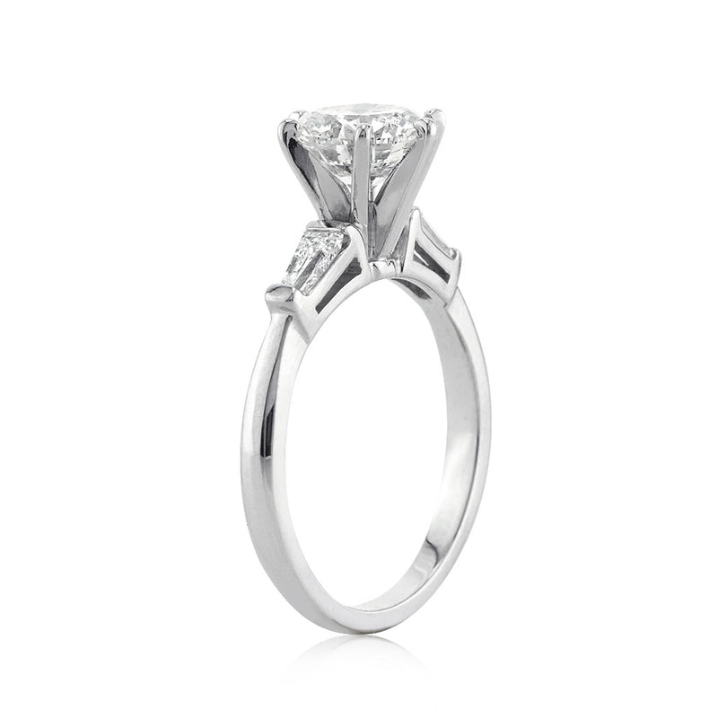 Enjoy the simplicity of the three-stone look with this striking round brilliant cut diamond ring. The stunning diamond set at the center of this 14k white gold setting is a 1.71ct round cut AGS graded at J-I1. Due to its great cut it faces up very white and brilliant and the inclusions are minute for a clean look. This is a perfectly proportioned round brilliant cut three-stone diamond ring that will be forever timeless.