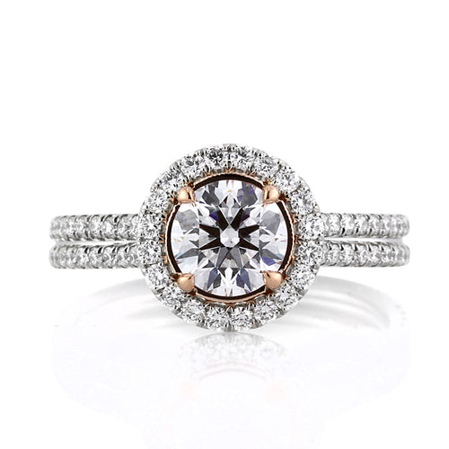 This incredible fancy pink round brilliant cut diamond is a true rare beauty. The extraordinary 1.04ct fancy pink round brilliant cut diamond poised at the center is GIA certified at Fancy Faint Pink-I1. The cut is fantastic giving the diamond maximum brilliance and the color unique and uncommon---it's a faint pink color! This one carat diamond has phenomenal value in the fact that the inclusions are clear giving you an eye clean look. This unique diamond is set in a hand engraved rose gold basket with a halo of micropave set round diamonds. The elegant shank features two rows of round diamonds in a micropave setting as well. This one of a kind ring will surely become a family heirloom.