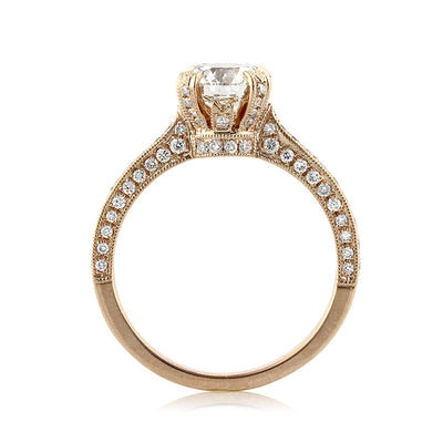This extraordinary rose gold diamond engagement ring is so very unique and beautiful! The gorgeous 1.25ct round brilliant cut center diamond is GIA certified at H-VS1. It is white, exceptionally clear, and very brilliant. The very beautiful center prongs showcase it perfectly, with round diamonds studded throughout the prongs. The shank is pave set with round diamonds on all three sides. This mesmerizing piece is absolutely spectacular from every angle.