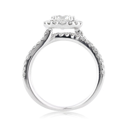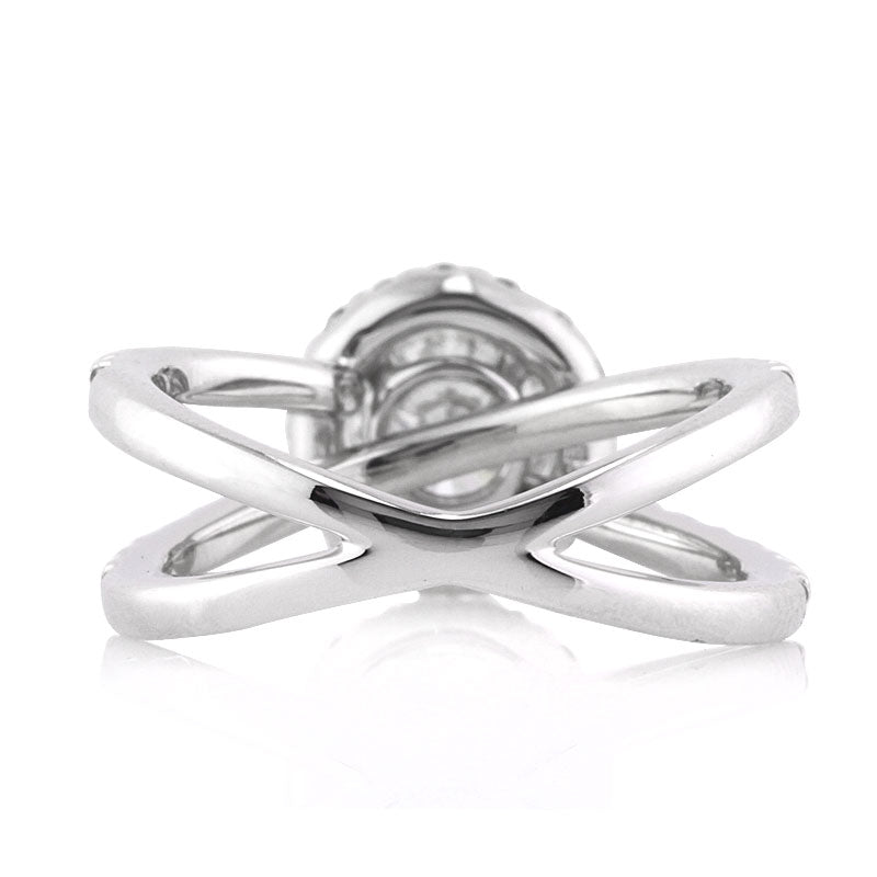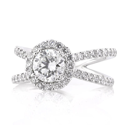 This mesmerizing round brilliant cut diamond engagement ring is so unique and exceptionally beautiful! The stunning 1.01ct round brilliant cut center diamond is GIA certified at H-VVS1. It is white, practically flawless and extremely brilliant! The diamond is accented by a halo of round diamonds set around it and a split shank the crisscrosses underneath it. The diamonds are all prong set to perfection, showcasing themselves beautifully! A truly magnificent engagement ring you will cherish!