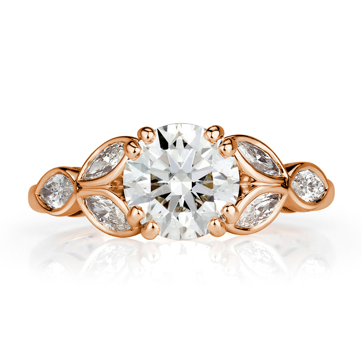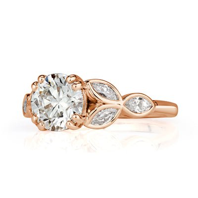 This very unique and beautiful round brilliant cut diamond engagement ring is gorgeous in so many ways. The stunning 1.51ct round brilliant cut diamond showcased in the center is GIA certified at J-VS2. It is white, eye-clean and sparkles with rainbow fire. The centerpiece is accented by bezel set marquise cut diamonds set on either side for an amazing finger coverage look! The white diamonds pop with brilliance against the soft, warm hues of the lovely 18k rose gold setting. It is absolutely mesmerizing!