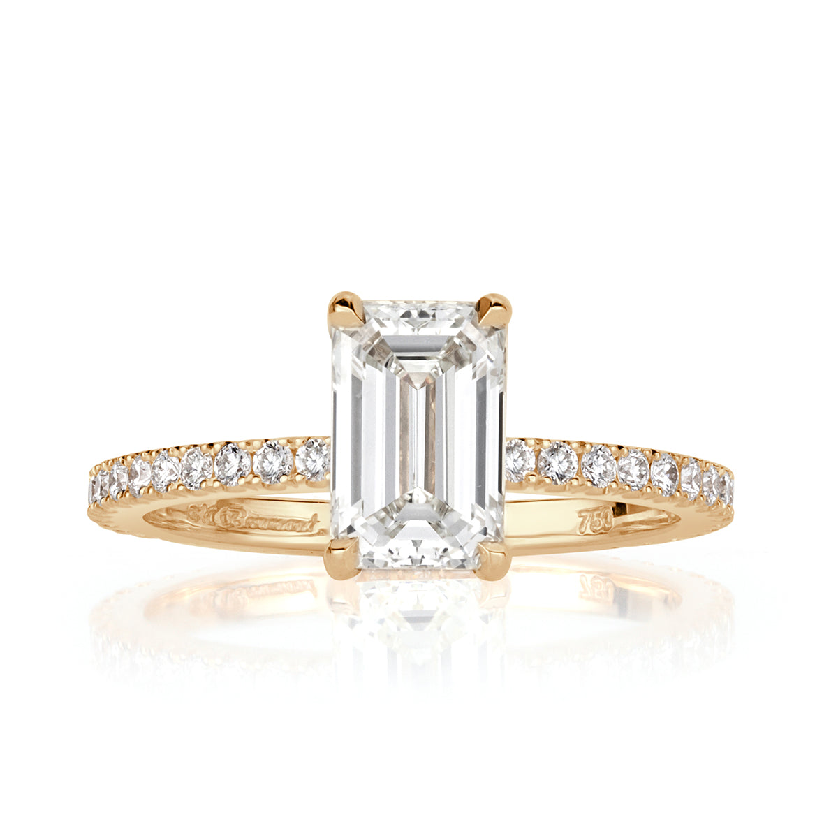This beautiful 18k champagne yellow gold diamond engagement ring is unique, yet classic. The 1.50ct emerald cut center diamond is GIA certified at J-VVS2, facing up a crisp white and extremely clean. This stunner measures at an incredible proportion of 8.24 x 5.32mm and covers tremendous finger coverage with it's large measurements. It is also graded at premium quality excellent for both polish and symmetry. The centerpiece is accented by shimmering diamonds in the hidden halo and shank in our chic 18k champagne yellow gold. This gorgeous emerald cut diamond engagement ring sparkles immensely just like your love!