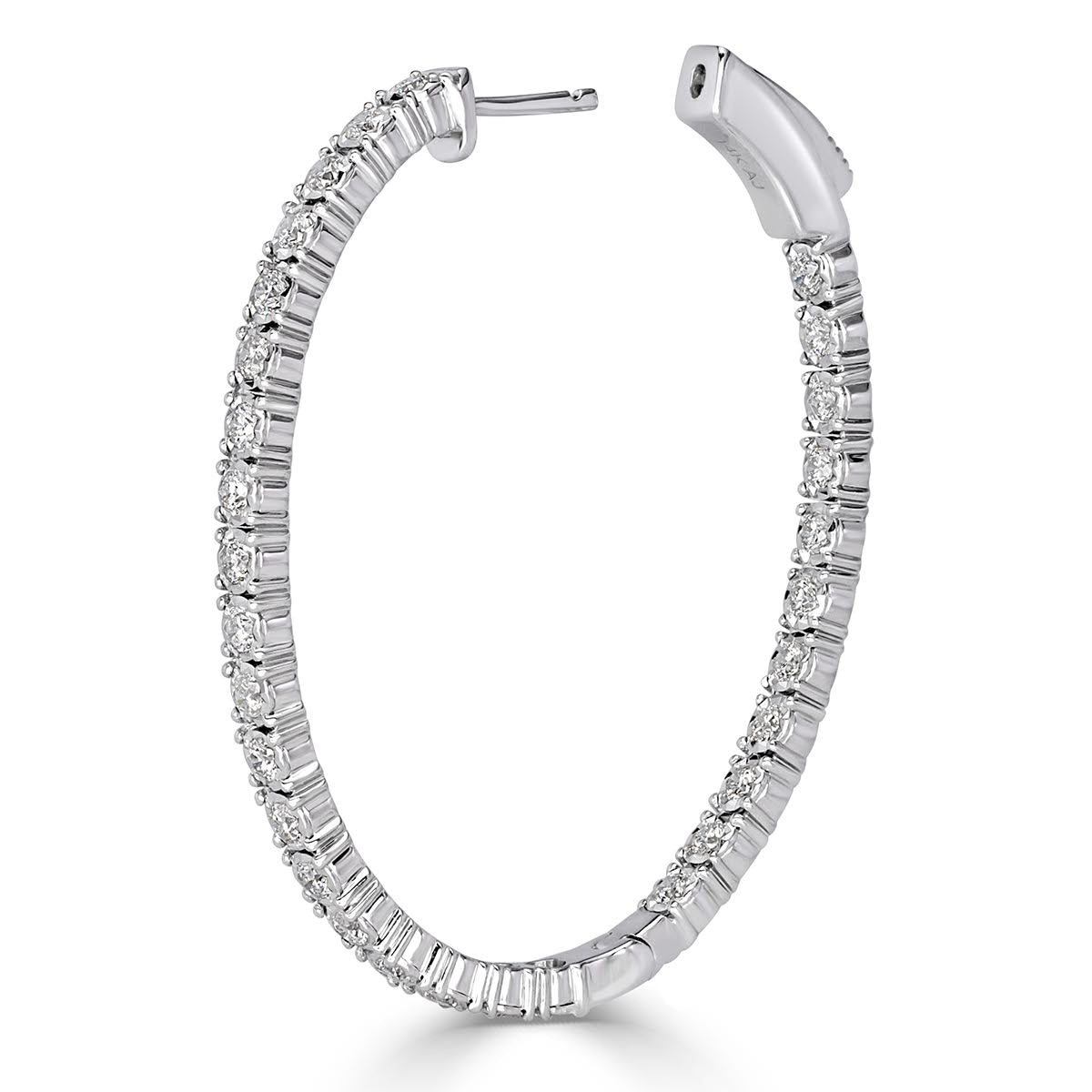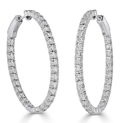 This stylish pair of diamond hoop features 1.98ct of round brilliant cut diamonds hand set in 14k white gold. The diamonds are matched and graded at E-F colors and VS2-SI1 clarities. For extra sparkle, the diamonds are set on the outside as well as on the inside of the earrings. Truly a unique pair that can be dress up or down according to the occasion!