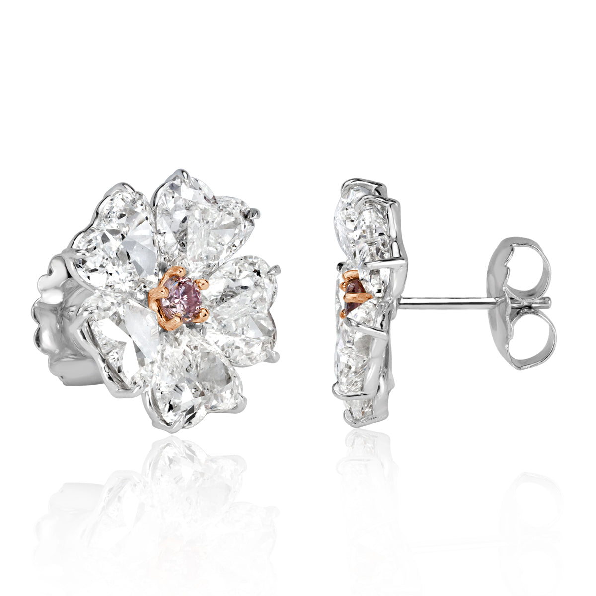 These 18k white gold diamond earring studs are feminine and truly one-of-a-kind. This design showcases 10.64ct of diamonds that are certified at G-I colors and VS2-SI2 clarities. The stunning heart shaped diamonds are styled as floral petals that are individually GIA certified, weighing in at just over 1 carat each. In the center of the design is a rare fancy pink diamond that is secured by rose gold prongs. These beauties are not only extremely unique but posess a beautiful allure that will mesmerize any who come across them.