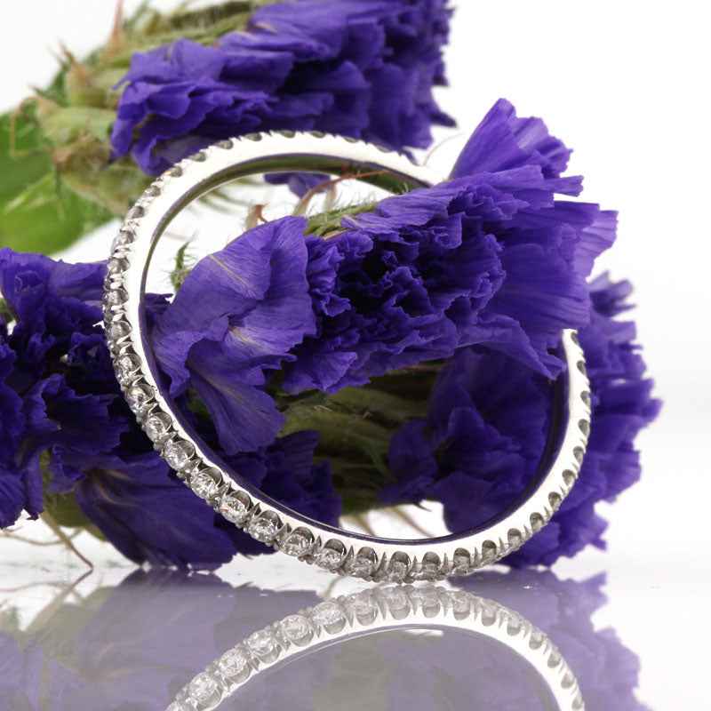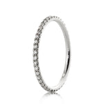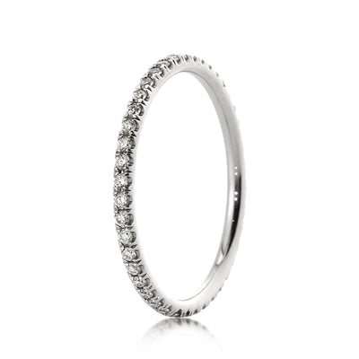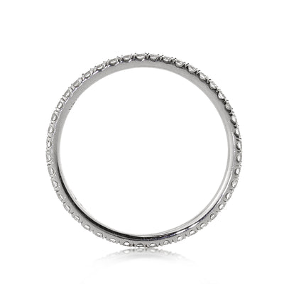 This elegant and beautiful round diamond micropave eternity band is a great match to any engagement ring or as a stand alone piece. Each diamond is hand selected to match perfectly and each one is hand set with the utmost attention given to detail. The band is set on high polish platinum and is available in 18K white gold as well.