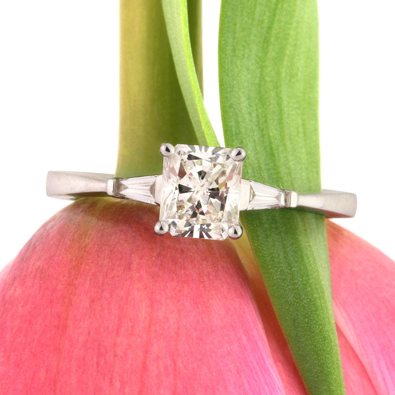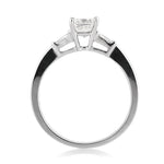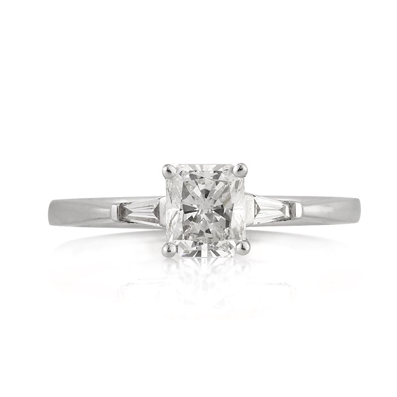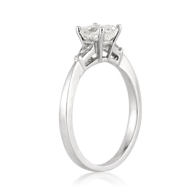 Simplicity at its best! This amazing radiant cut diamond engagement ring features a stunning 0.91ct radiant cut diamond in the center. It is GIA certified at H-VS2, white and perfectly clear! It is accented by two baguette cut diamonds flanked on its sides. The combination of a radiant cut diamond and baguette diamond accents is so beautiful! The ring is made of high polish 18k white gold. A stunning engagement ring you will love!